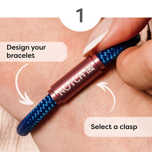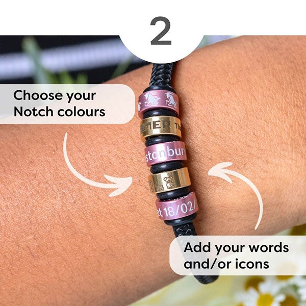 Notches fit perfectly over one end of an open NOTCH Bracelet clasp. You’ll receive two rubber spacers to place either side of each Notch, so as your collection grows they will sit snugly and safely on your Bracelet. You'll be able to fit at least 20 Notches onto a Bracelet.